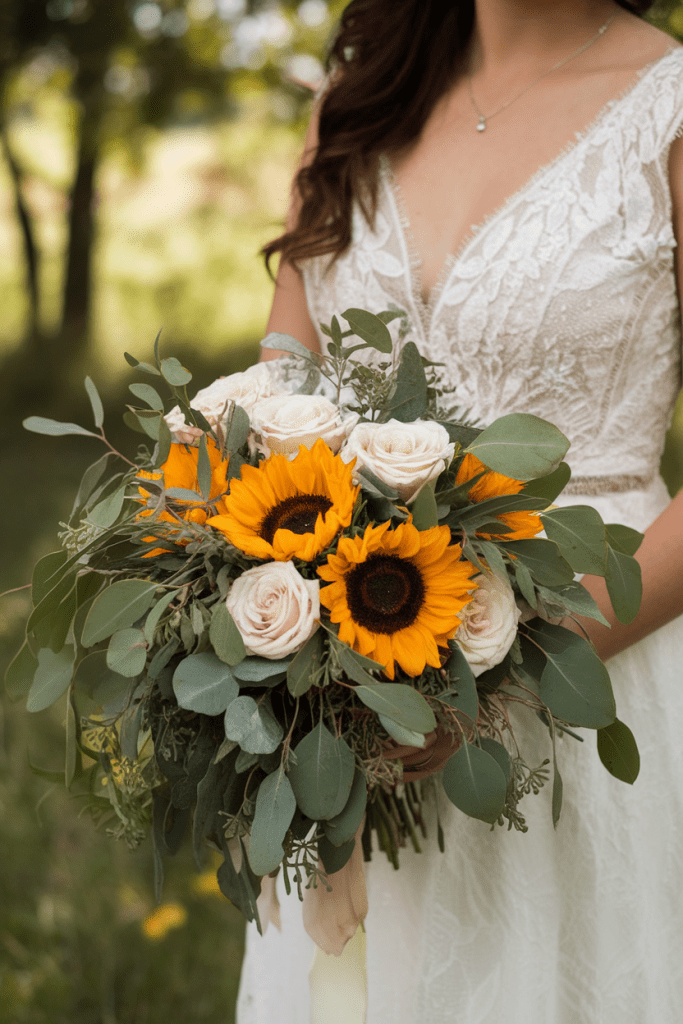 Eucalyptus greens soften the boldness of sunflowers, creating earthy contrast. Add ivory roses for a romantic touch.