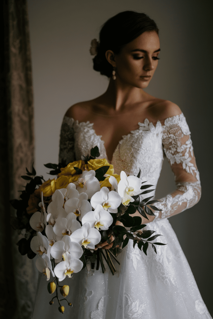 Yellow orchids are sleek, exotic, and undeniably chic. A cascading orchid bouquet feels like something off a couture runway.