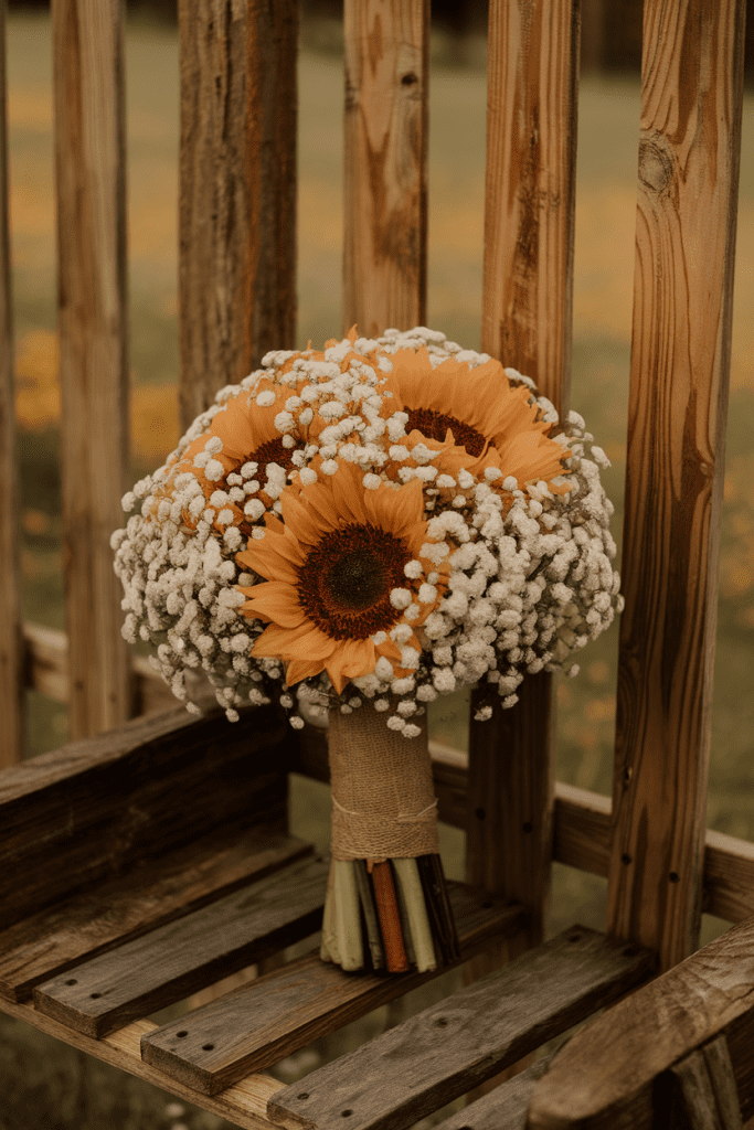 Want rustic romance? Pair sunny sunflowers with dainty white baby’s breath. It creates the perfect mix of bold and soft.