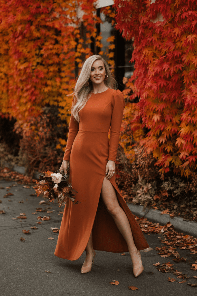 Burnt orange can feel risky, but when done right, it’s autumnal perfection. A maxi with a slit makes it bold but still wearable.