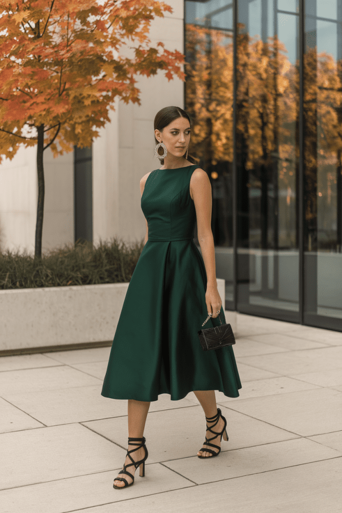 Emerald is that girl. A structured midi in this shade paired with statement earrings is a guaranteed compliment magnet.