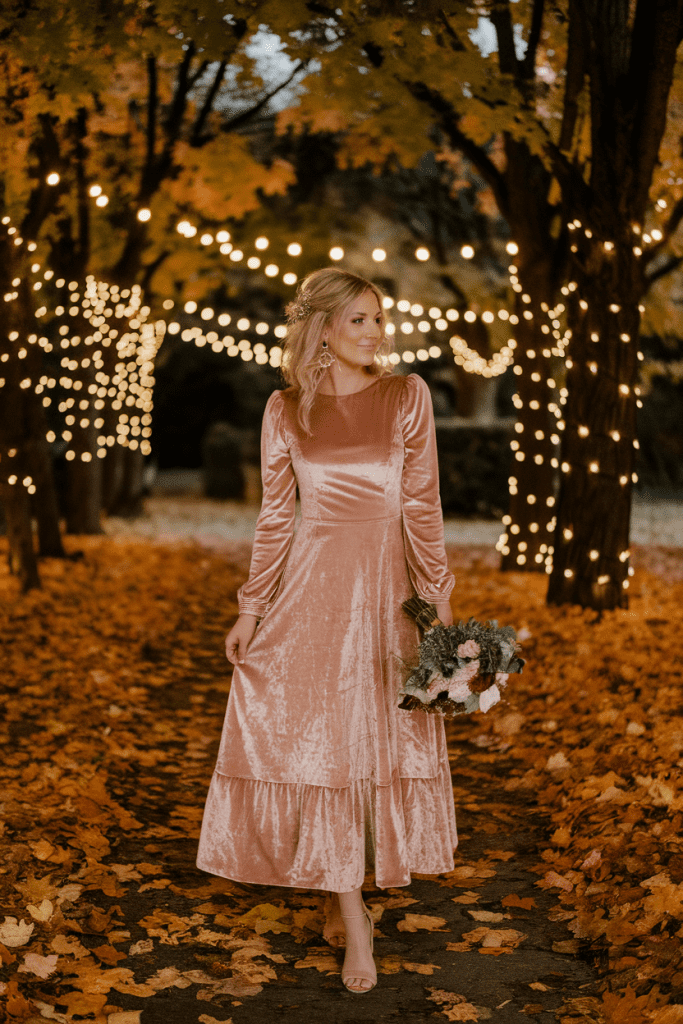 Blush doesn’t have to be reserved for spring. A blush velvet dress with long sleeves feels romantic, cozy, and a little unexpected for fall.