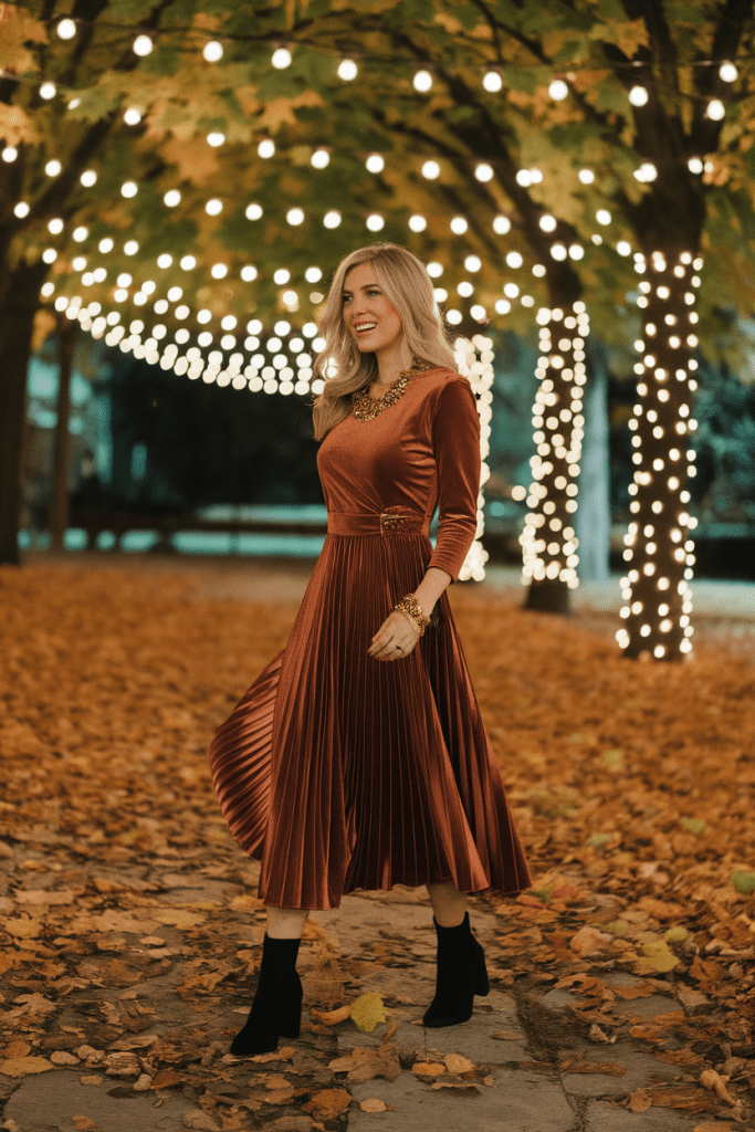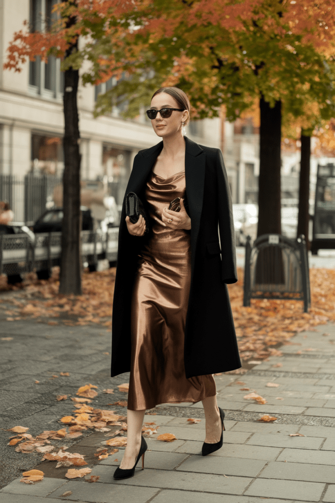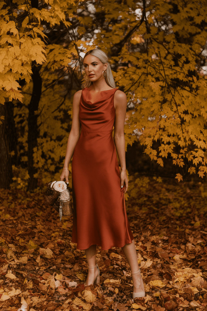 Rust is the color of fallen leaves, and honestly, it might be autumn’s best-kept secret. A satin cowl-neck midi in this shade looks luxe without being over the top.