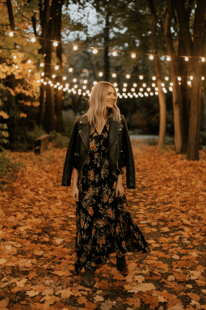 Florals in fall? Absolutely, if you go dark. A dark floral maxi paired with heeled ankle boots is equal parts romantic and practical.