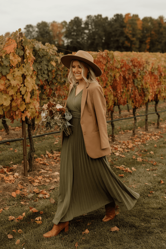 Olive green is criminally underrated. A flowy olive maxi is ideal for rustic barn or vineyard weddings where the backdrop is already pure autumn aesthetic.