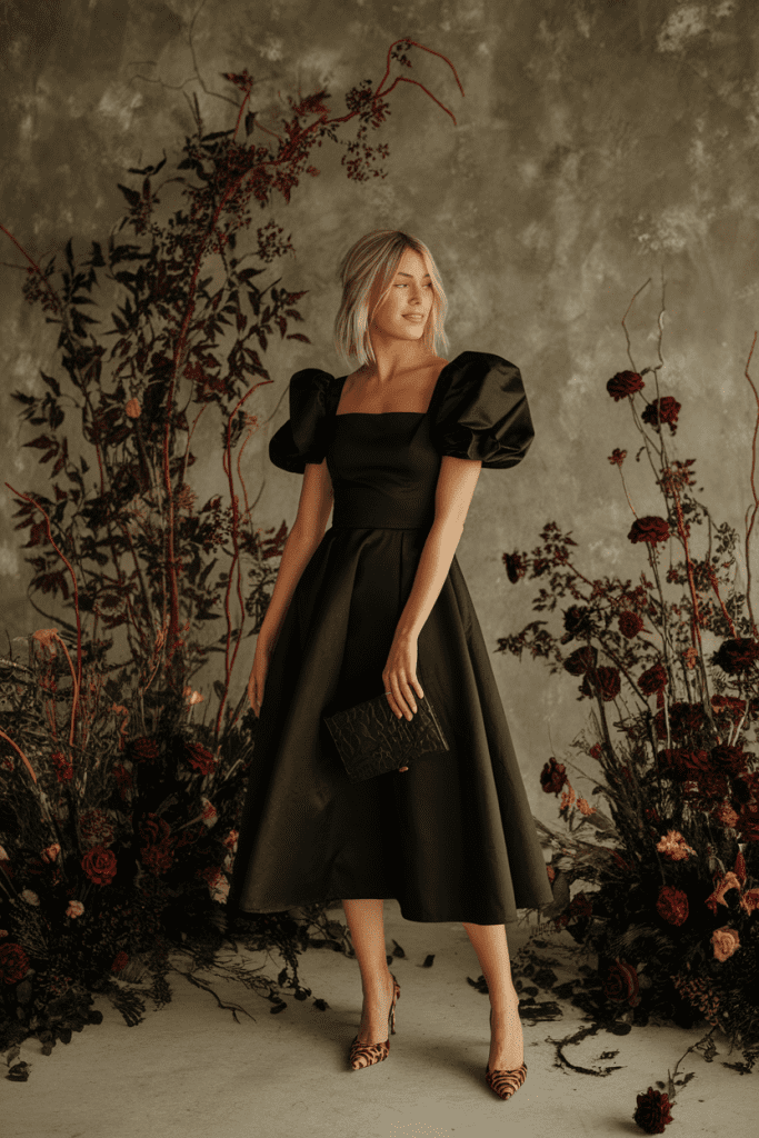 Want drama without drama? A black puff-sleeve midi delivers moody chic vibes while still being completely appropriate. It’s witchy in the best way.