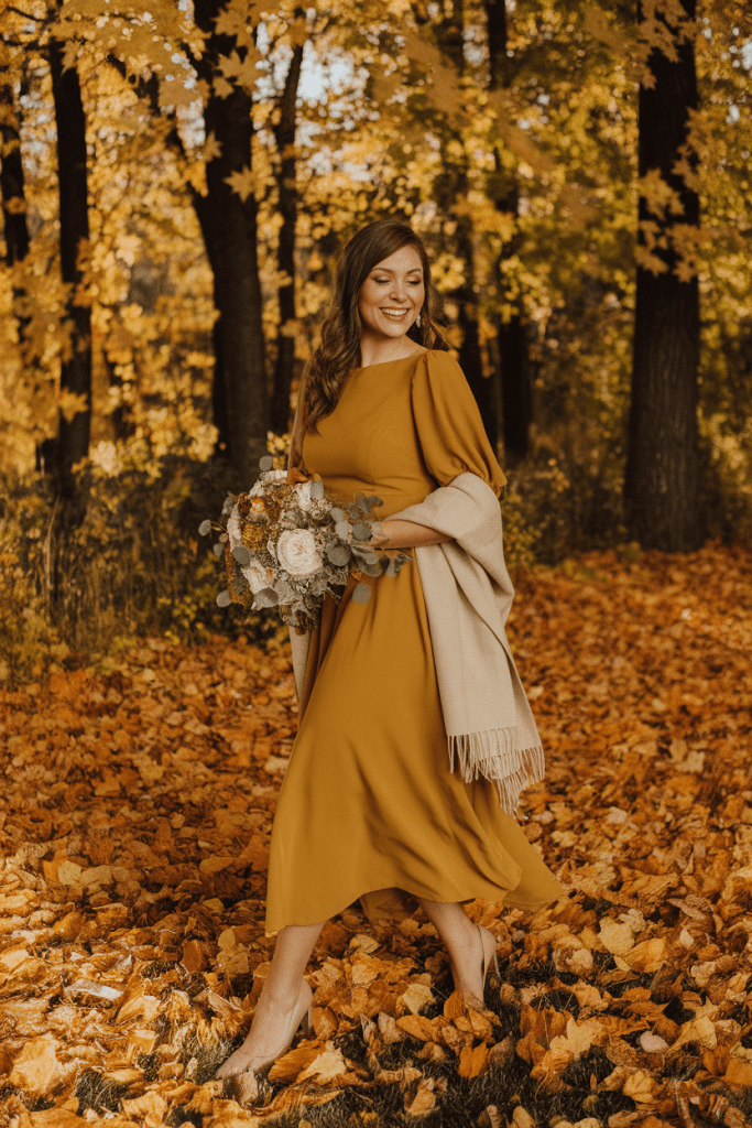 Mustard yellow in autumn? Iconic. A flowy-sleeved midi in this shade makes you look like you belong in a golden hour editorial. It’s playful but still classy enough for a wedding.