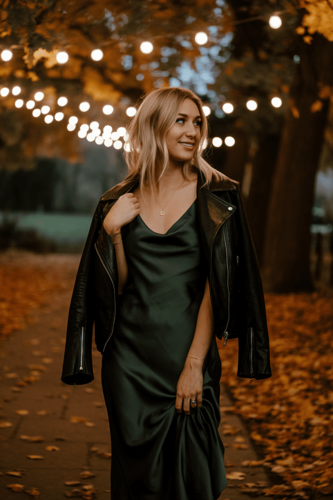 Slip dresses aren’t just for rooftop bars in July. A forest green satin slip layered with a black leather jacket feels chic, effortless, and slightly rebellious in the best way.