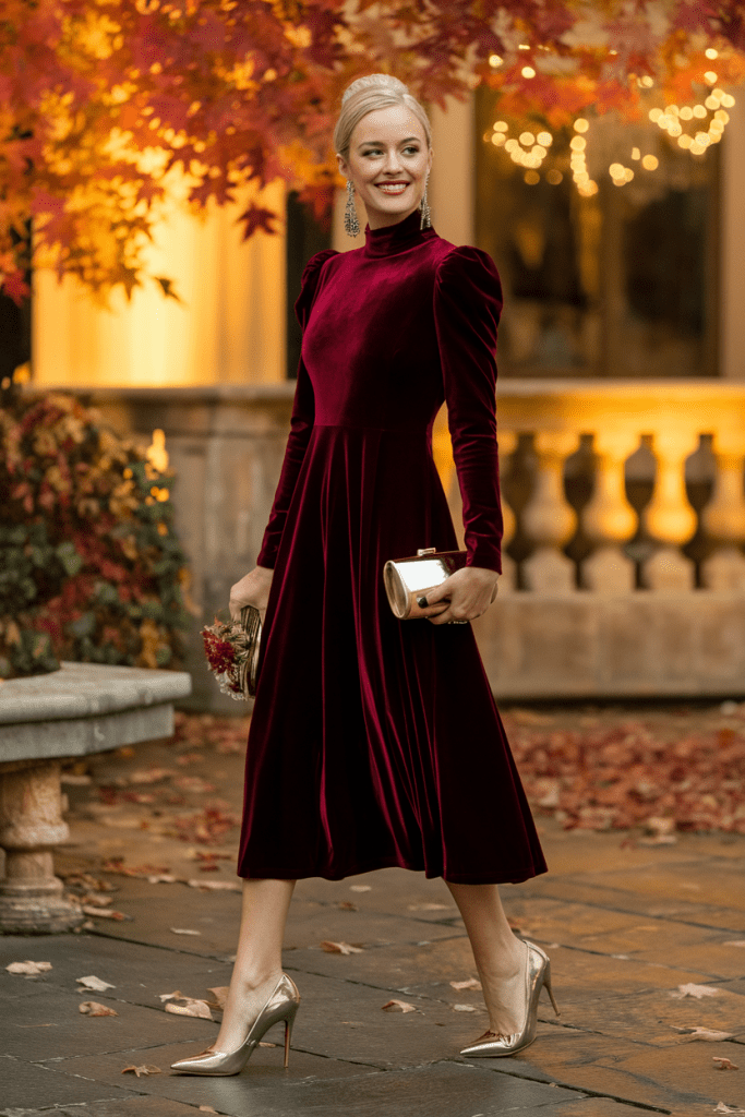 Burgundy velvet is basically the fall wedding starter pack. A velvet midi in this shade gives rich, luxe vibes and flatters everyone. It’s warm enough for a chilly evening but still polished for an indoor reception.