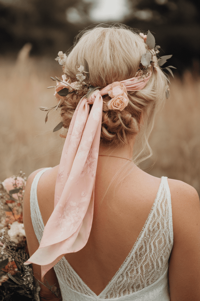 Choosing the right hair accessory can elevate your hairstyle, especially for that dreamy bohemian vibe. The image shows a beautiful look where a soft scarf is elegantly draped, paired with delicate floral accents. This combination is perfect for creating a relaxed yet romantic atmosphere.