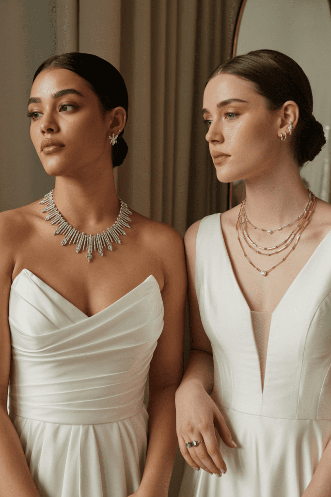 When choosing bridal jewelry, striking the right balance between statement pieces and simpler designs is key. The image shows two stunning styles that complement different dress necklines beautifully. On the left, you see a bold necklace that works well with a V-neck dress, while the right showcases a more delicate piece that fits a sweetheart neckline.