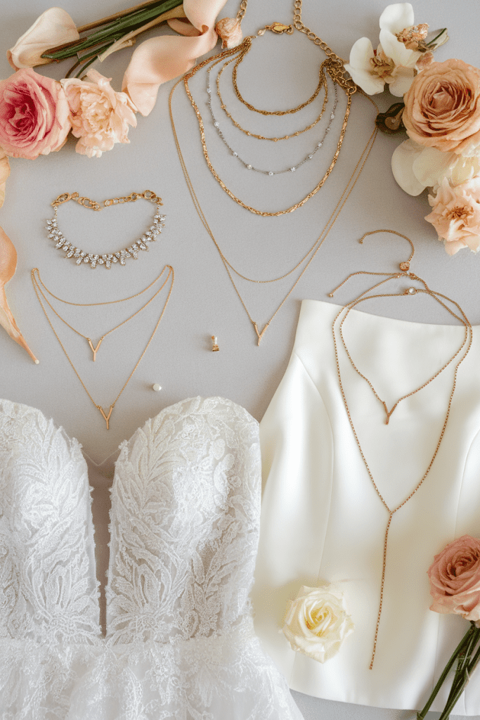 When selecting a necklace for your wedding dress neckline, consider the style of your dress. For a strapless gown, a statement necklace can enhance your neckline beautifully. On the other hand, if you’re wearing a high-neck design, simple earrings or a delicate bracelet might be the perfect fit.