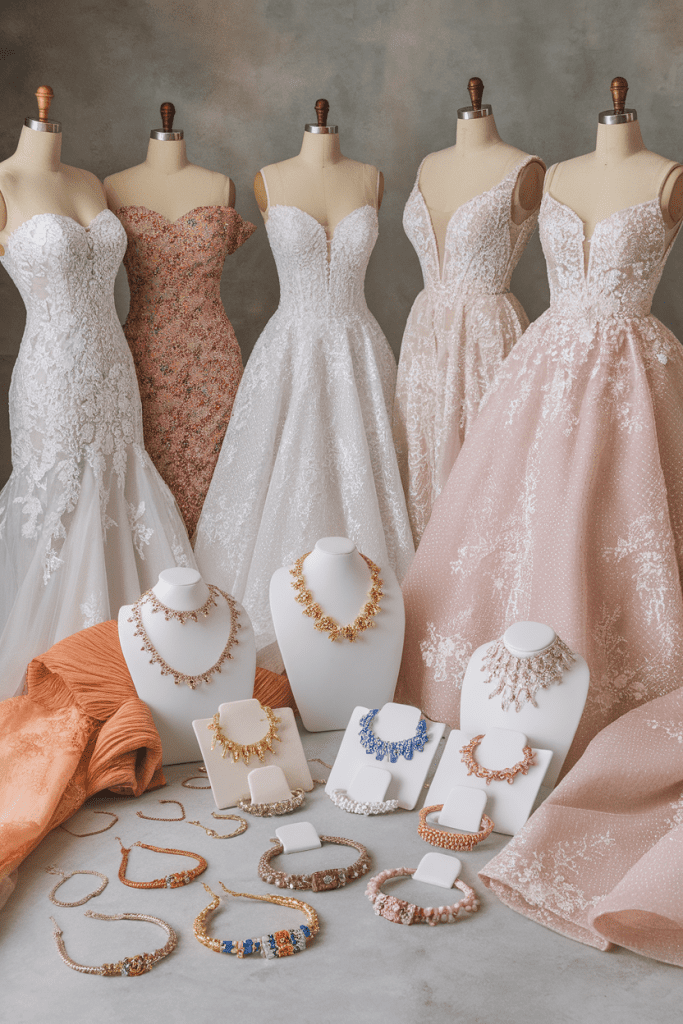 Choosing the right accessories for your wedding dress is all about the color. In our image, you can see various bridal jewelry styles that beautifully complement different dress designs. The colors and styles are key to enhancing your overall look.