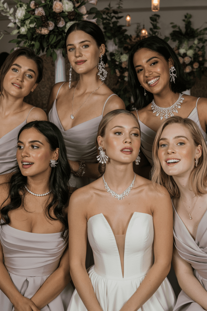 Choosing the right jewelry for your wedding reception is key to completing your bridal look. The image displays bridesmaids and a bride, each adorned with beautiful jewelry that complements their outfits. Notice how the sparkling earrings and necklaces draw attention while still balancing the overall look.