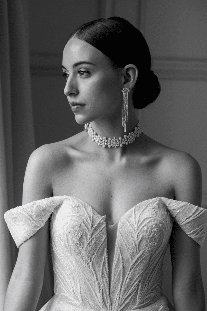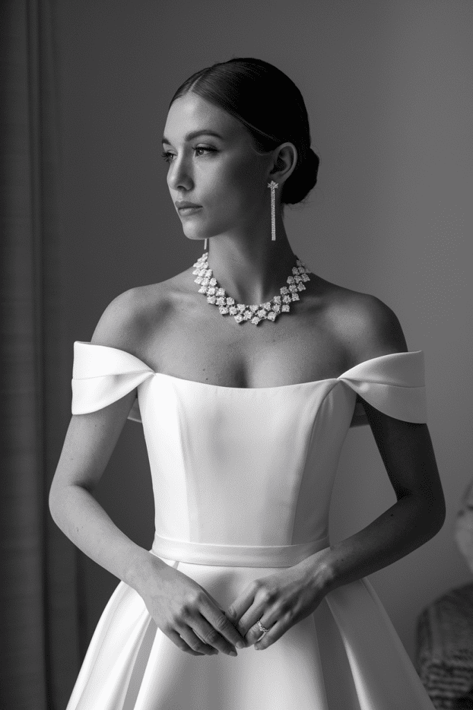 Off-the-shoulder dresses bring a romantic touch to any bridal look. With this neckline, showcasing the collarbones creates an opportunity for stunning jewelry choices. The image highlights a beautiful model wearing a chic off-the-shoulder dress, paired with striking earrings and a matching choker.