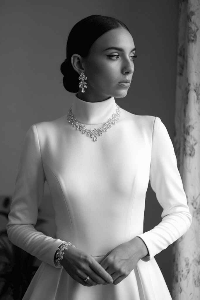 A delicate necklace with a subtle sparkle can work wonderfully too. The necklace in the image adds just the right amount of detail, balancing the look without competing with the turtleneck. This approach ensures that you maintain a cohesive bridal look.