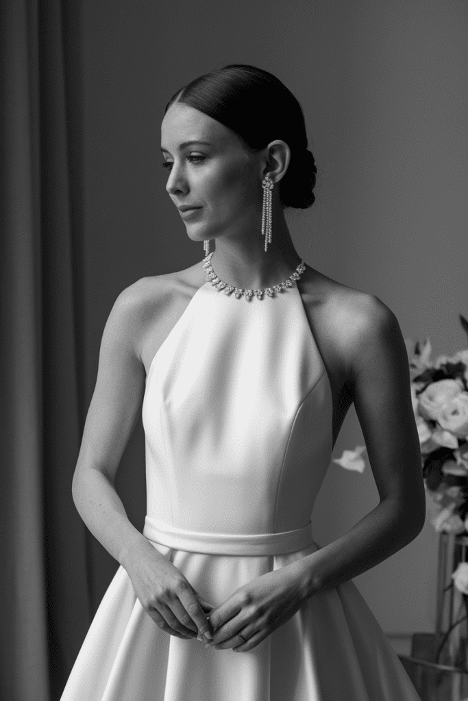 When you’ve chosen a halterneck dress, the right jewelry can really make your look shine. This style leaves your shoulders and neck bare, which is perfect for showcasing beautiful accessories. A stunning necklace, like the one in the image, draws attention and elevates your bridal attire.
