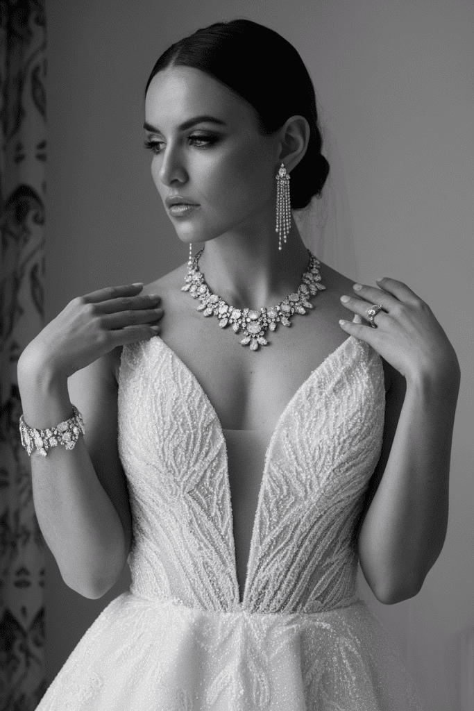 For those considering bridal jewelry for necklines, remember to keep the overall style in mind. Matching jewelry and dress is key, so make sure the metals and stones coordinate well with the gown’s embellishments. This keeps the look polished and intentional.