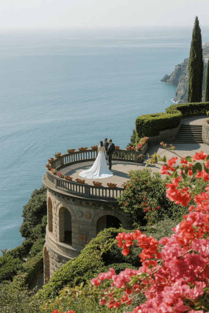 Couples choosing Villa Cimbrone enjoy the blend of ocean vistas, vine-clad terraces, and warm Mediterranean climate, ideal from late spring through early autumn.