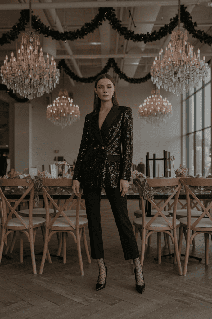 For a non dress option, try the sequin blazer and slim pants combo. It’s powerful, festive, and transitions beautifully.