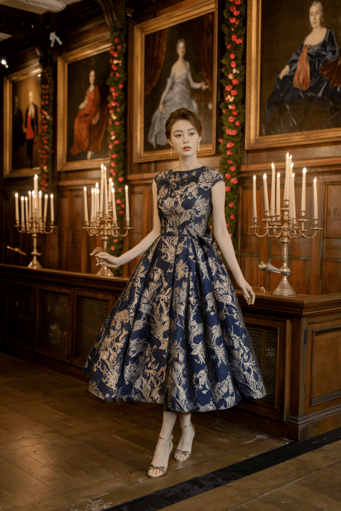 The brocade cocktail dress has that rich texture that screams fall and winter. Gold on navy feels luxe in October; black on ruby feels festive in December.