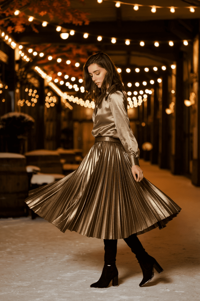 A metallic pleated midi floats in fall and glimmers in winter. Gold and pewter look gorgeous against both autumn sunsets and snowy evenings.