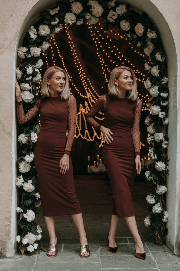 The burgundy midi bridges seasons perfectly. The sheer sleeves keep it light enough for fall, but the deep color makes it winter appropriate too.