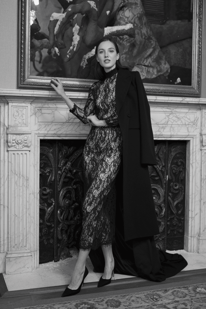 The black lace column dress is timeless elegance that works in every season. In fall, it feels dramatic with bare arms; in winter, layer with a sleek tailored coat.