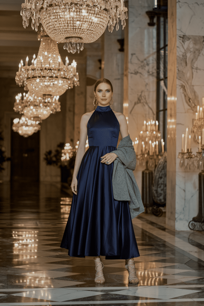 The high neck satin maxi is refined without being fussy. It’s breathable for fall ceremonies but covers enough for chilly nights. Navy or wine shades are perfect across seasons.