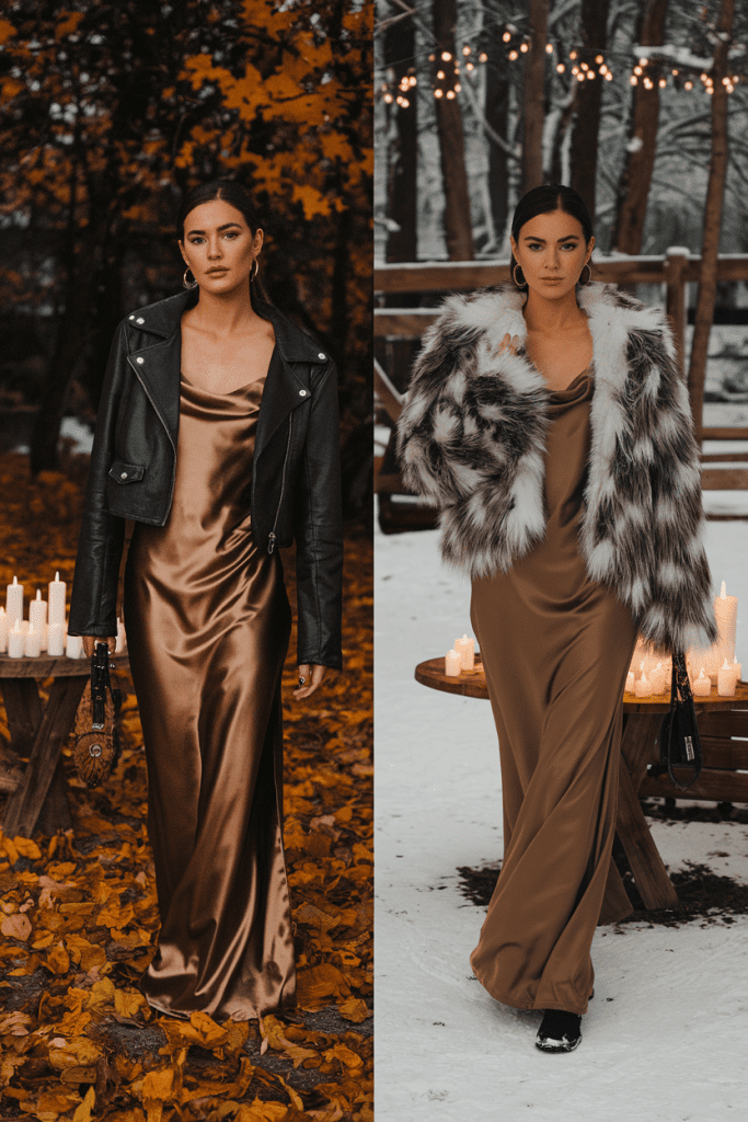 A satin slip dress screams sleek sophistication, but it’s not exactly warm. That’s where the cropped jacket comes in—think leather in fall, faux fur in winter. Champagne, bronze, or plum satin looks killer.