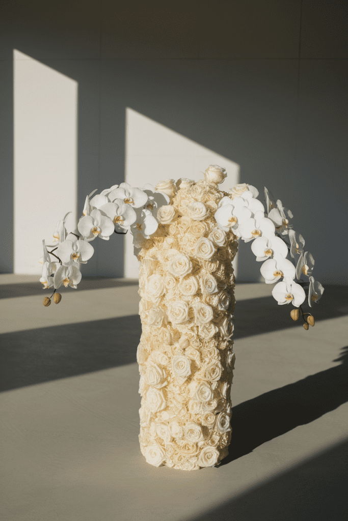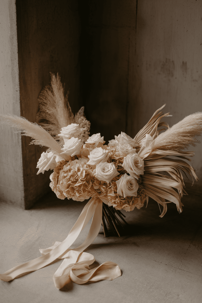 Sometimes it’s not about color, but texture. Mix roses, hydrangeas, dried accents, and fluffy pampas in neutral tones. It’s couture minimalism done right.
