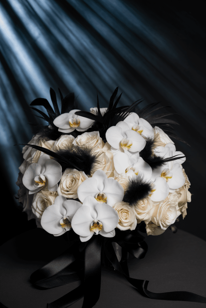 Want pure luxury? Go black and white. White blooms paired with black feathers, ribbon, or even dyed florals create a couture moment that feels fashion-week ready.