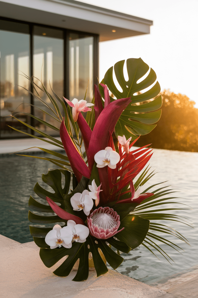 Who says luxury can’t be bold? Picture orchids, protea, and monstera leaves arranged like wearable art. It’s couture in a tropical palette.