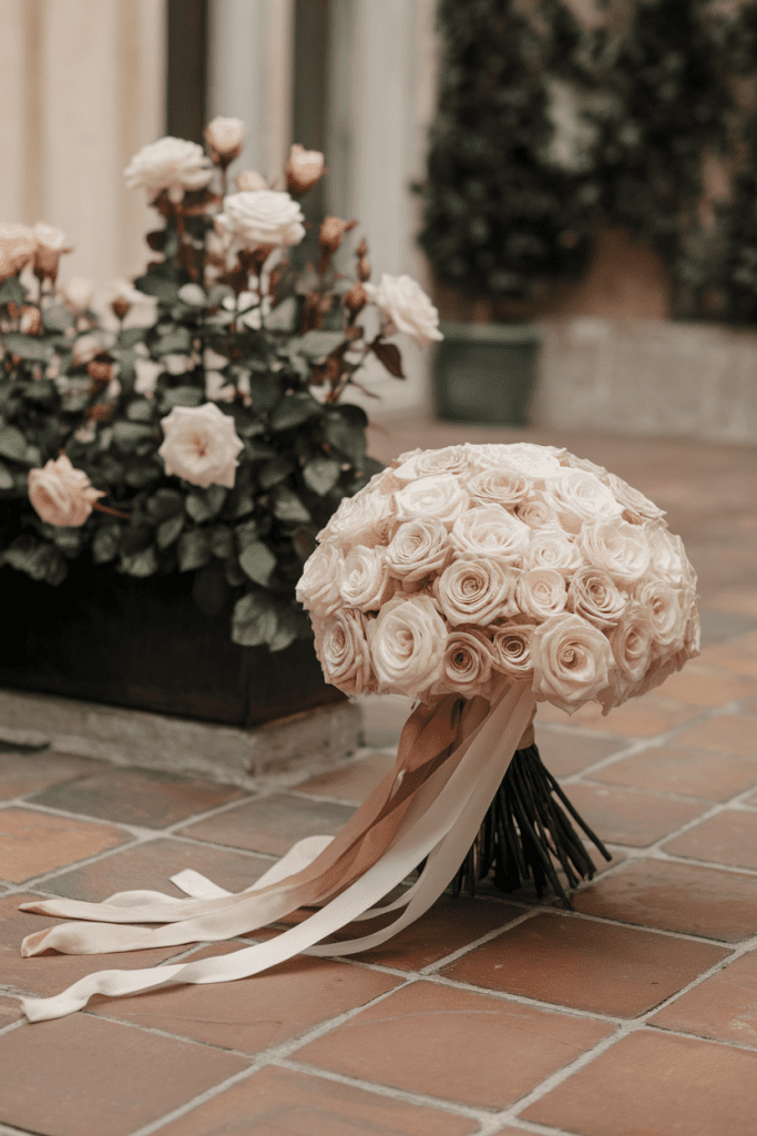 Garden roses already scream romance, but drape the stems with long silk ribbons in soft neutrals, and suddenly you’ve got a fashion moment.