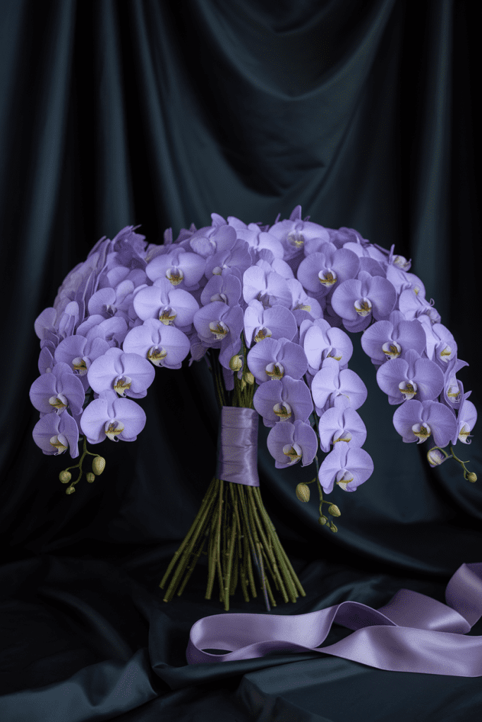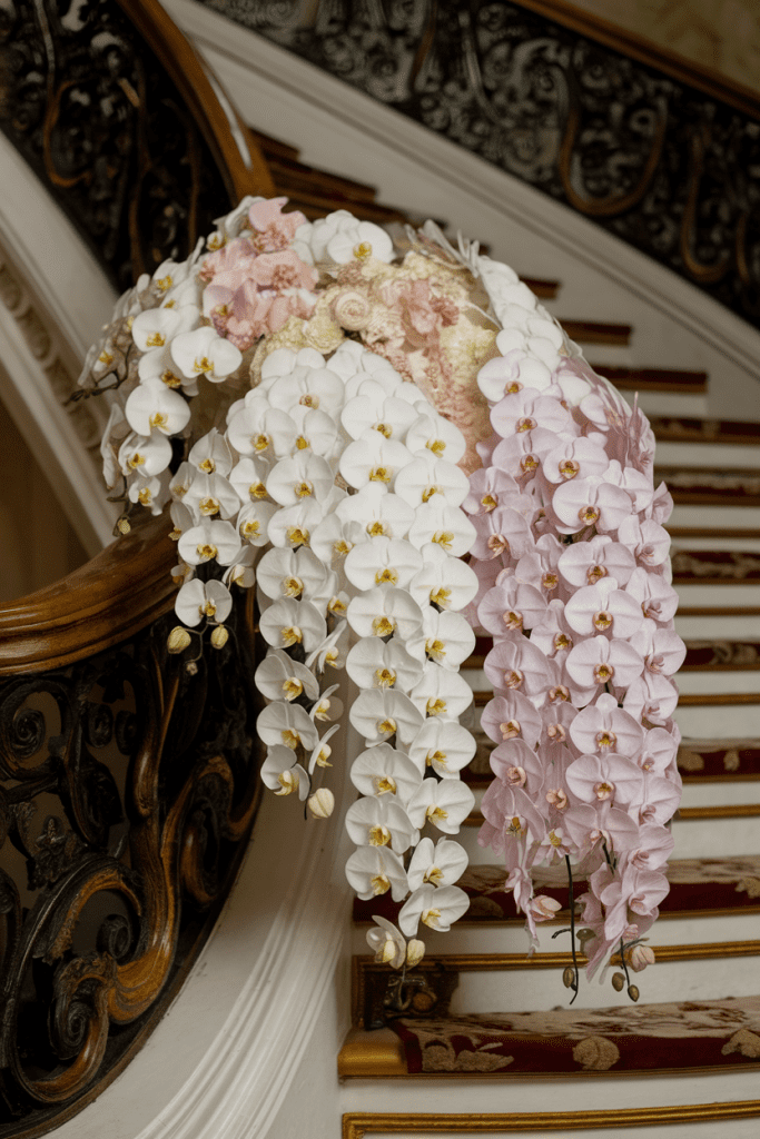 The cascading bouquet is back — but make it luxury with nothing but orchids. Long trails of phalaenopsis orchids look like waterfalls of petals. It’s dramatic without trying too hard.