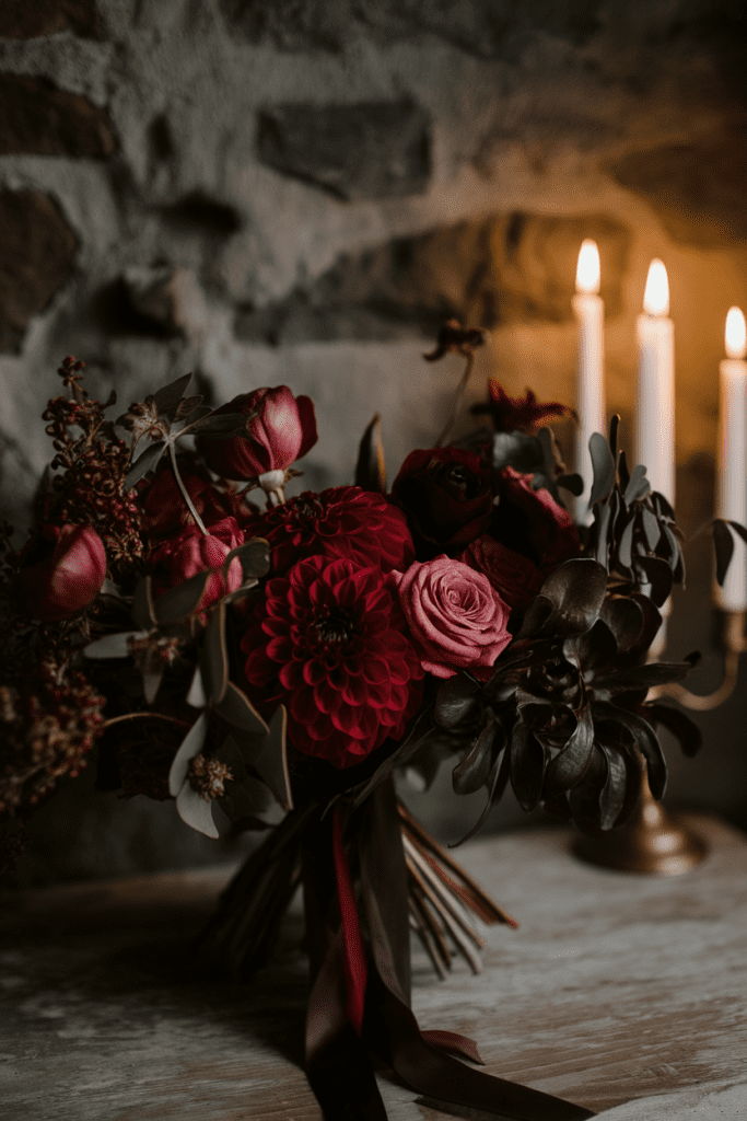 Burgundy flowers paired with moody greenery create a bouquet that feels like a couture gown from Valentino’s fall collection. Rich, dramatic, unforgettable.