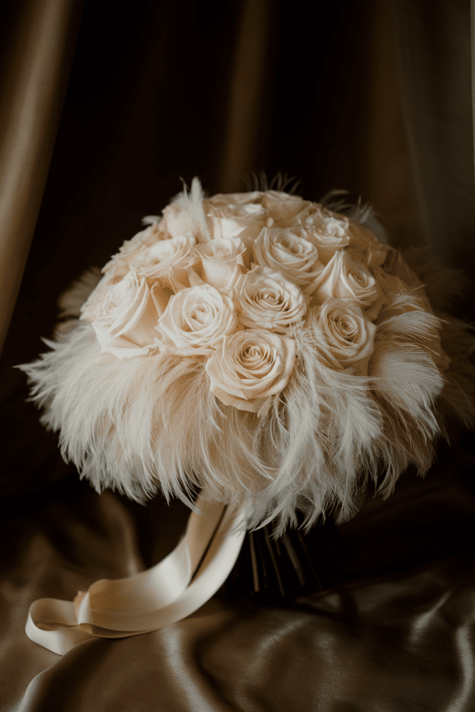 Florals + feathers = pure couture fantasy. Imagine ivory roses paired with delicate ostrich feathers fanning out. It’s playful, glamorous, and definitely a “main character” bouquet.
