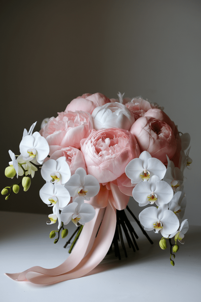 Peonies bring romance, orchids bring drama — together, they’re unstoppable. This combo is lush, oversized, and feels like it belongs on a high-fashion editorial shoot.