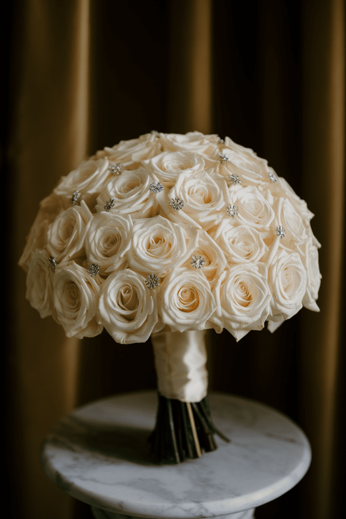 The ultimate in chic minimalism: layers of creamy white roses wrapped tightly, with tiny crystal pins tucked into the centers. It’s sleek, it’s elegant, and it gives serious old-Hollywood energy.