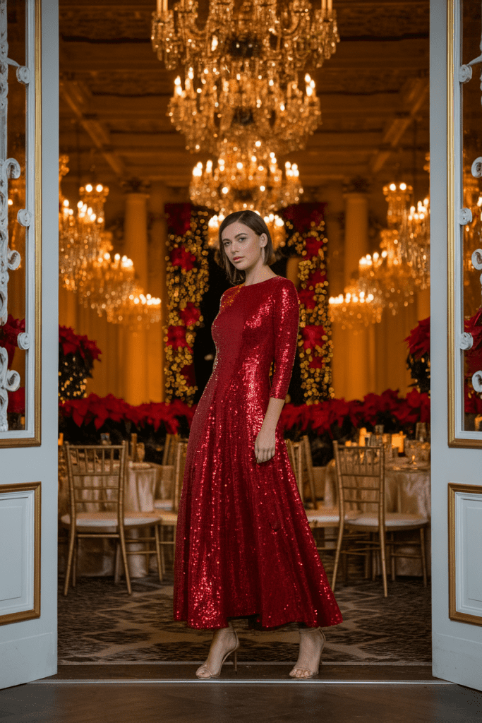 Nothing says festive quite like red lace. A fit and flare cut balances romantic texture with comfort (because, yes, you’re eating a full dinner). The lace catches light beautifully, especially near candle centerpieces.