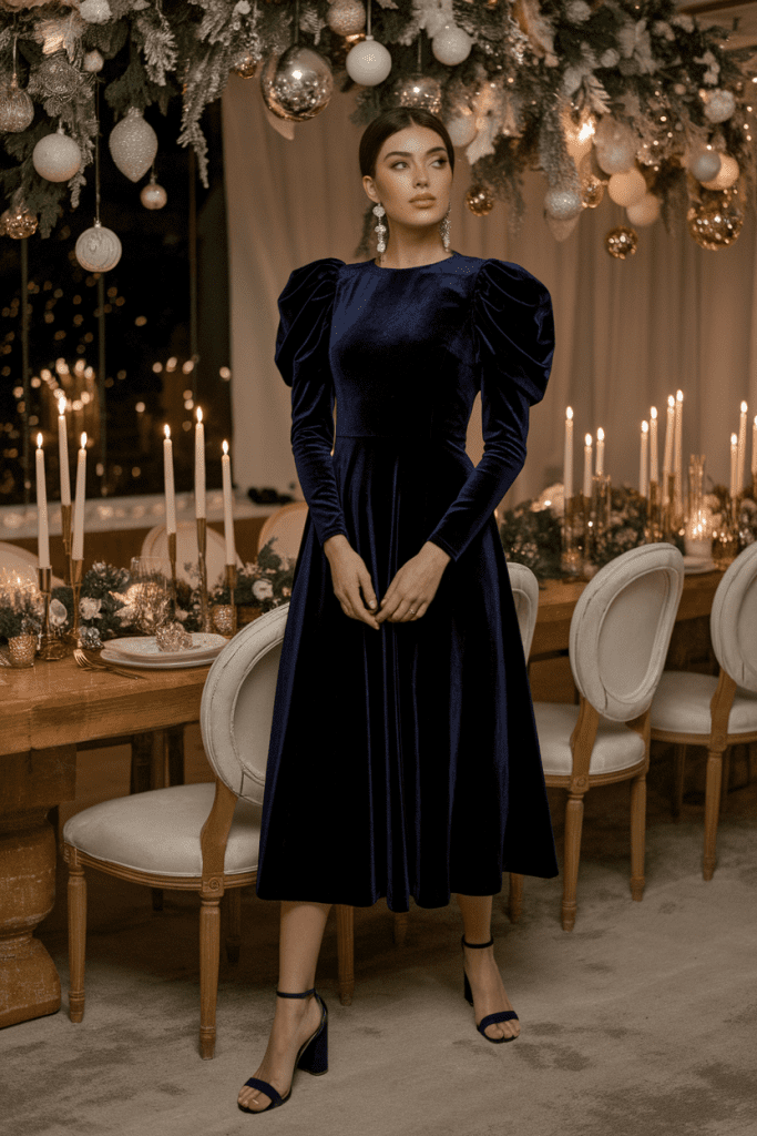 A velvet midi with puff sleeves feels playful yet elegant. The texture makes it winter ready, while the puff detail adds drama. Go navy or ruby for extra seasonal vibes.