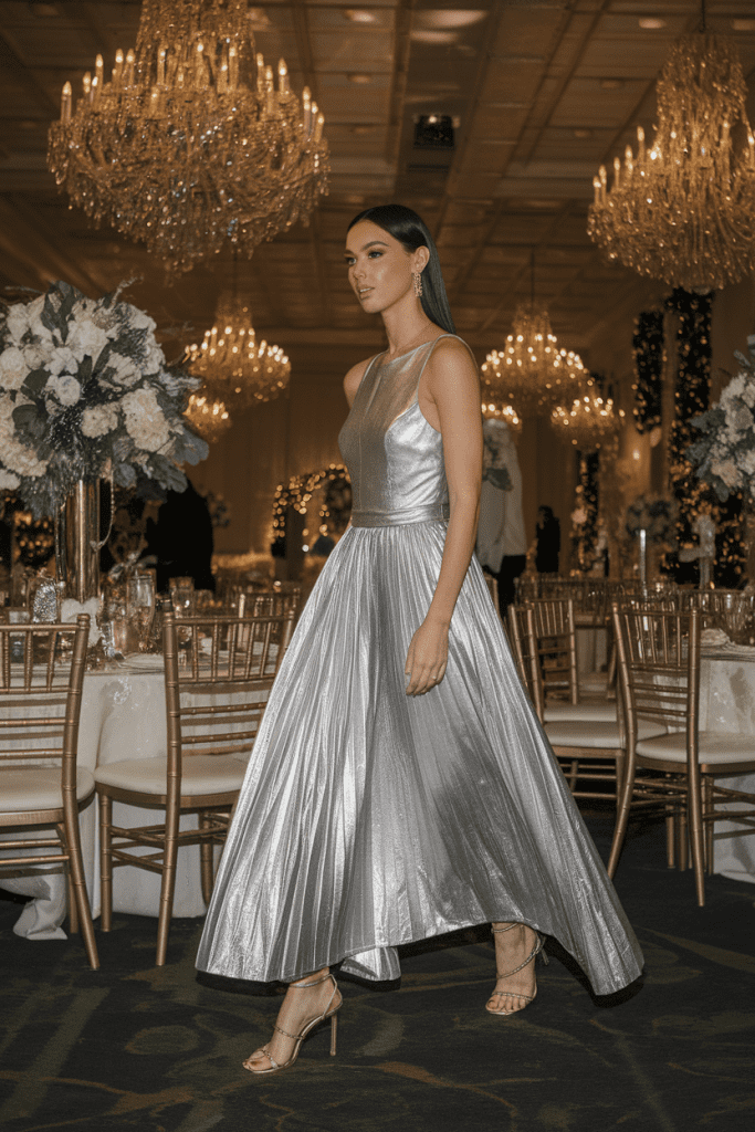 Nothing says party like a metallic maxi. Go silver, pewter, or rose gold depending on your jewelry game. The shimmer looks unreal under reception lights.