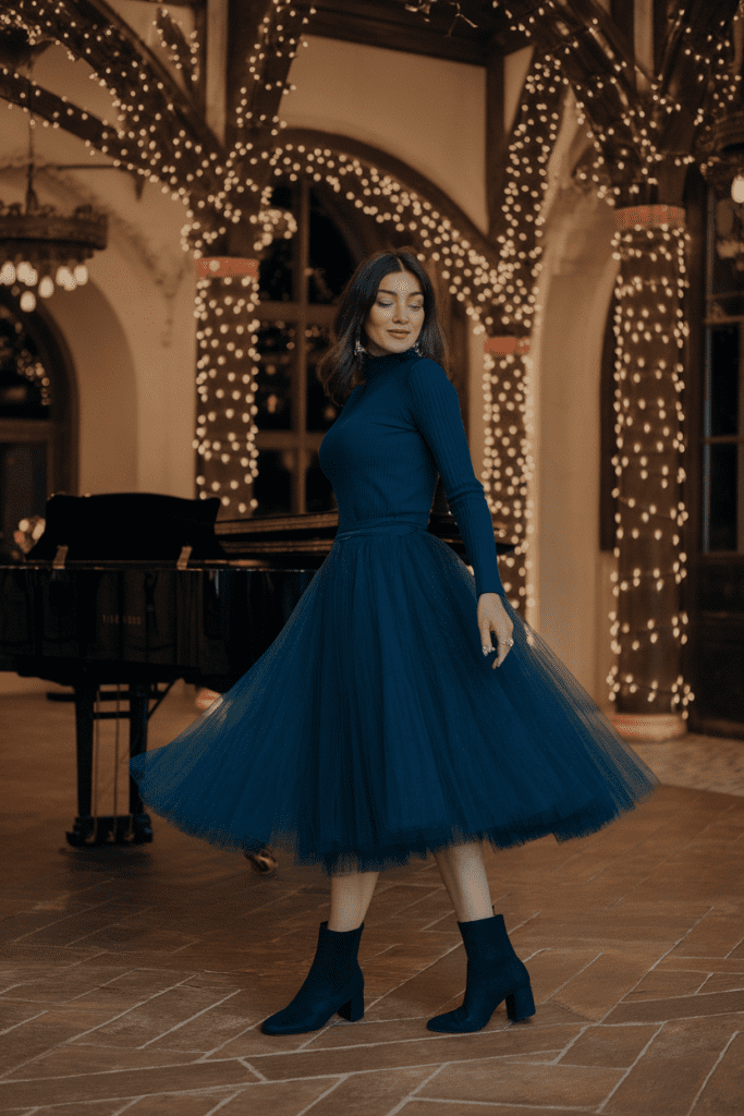 Tulle skirts don’t have to be bridal. A jewel tone tulle skirt paired with a fitted knit top gives whimsical holiday vibes. Think deep plum or sapphire.