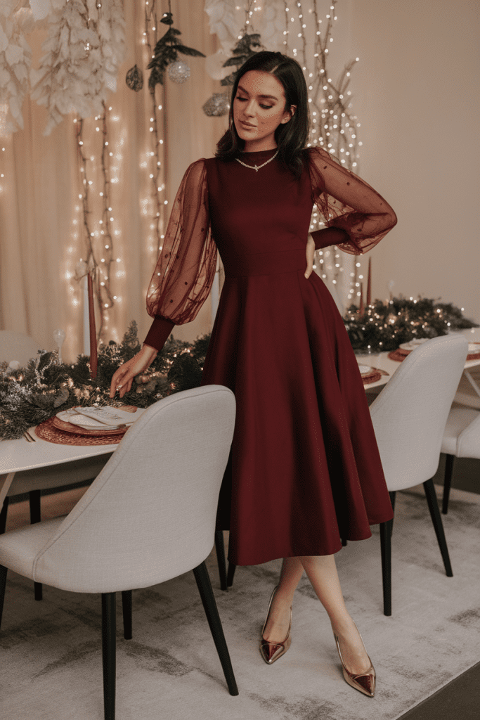 The burgundy midi dress with sheer sleeves balances elegance with subtle playfulness. The sheer detail adds lightness while the rich color ties it to the season.
