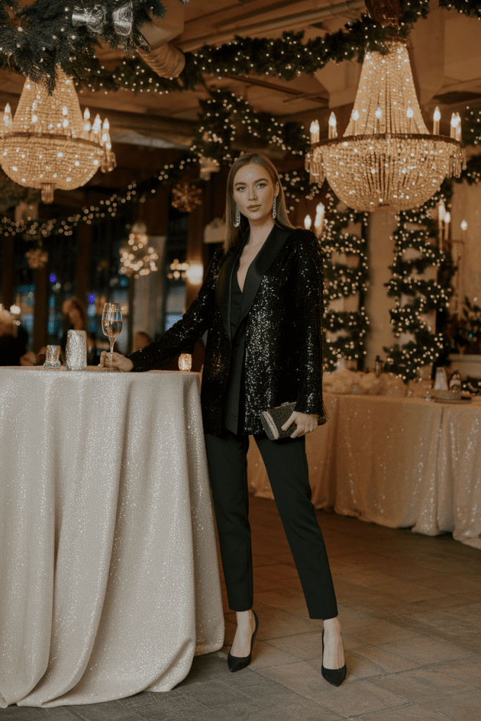 Want glam without a gown? A sequin blazer with slim tailored pants screams cool girl wedding guest. It’s festive, sharp, and practical for winter.