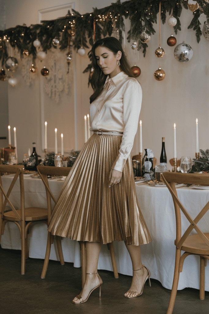 If dresses aren’t your thing, go separates. A gold pleated midi skirt paired with a silk blouse (cream or blush works best) is festive without trying too hard. The skirt shimmers when you move, which is ideal for dancing later.