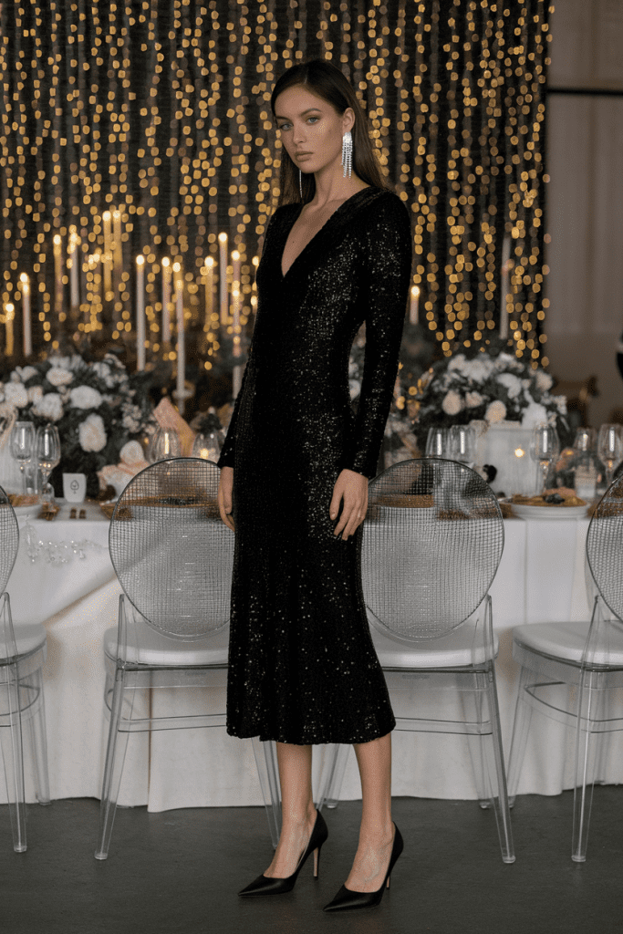 Pair with crystal earrings and a bold clutch for holiday edge. Guests love this because it’s timeless elegance made seasonal with styling.