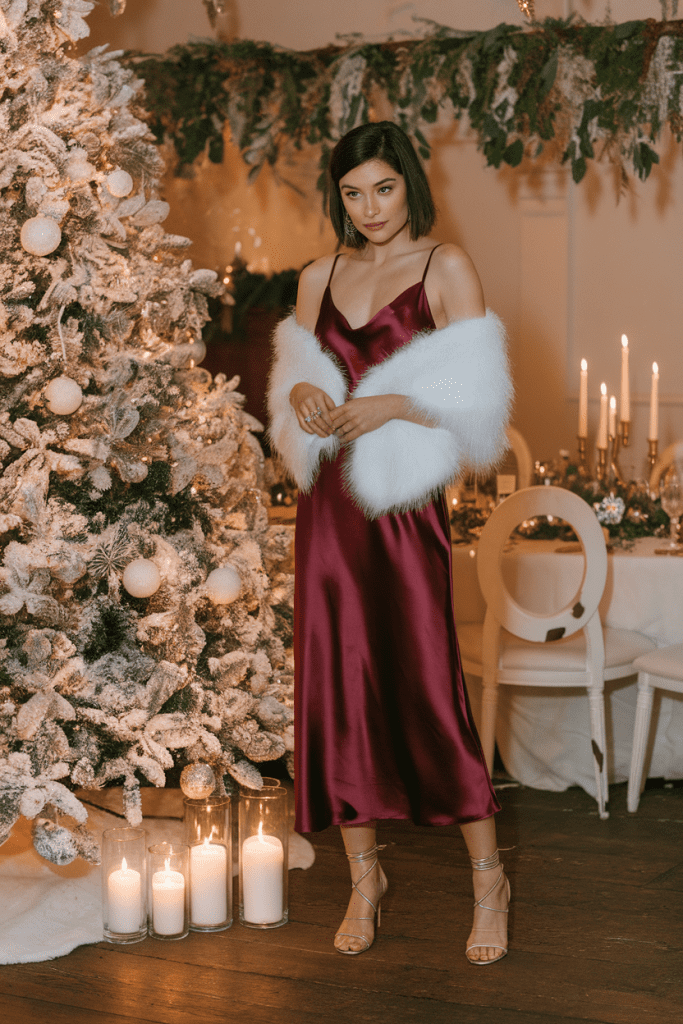 If there was ever a time to pull out a satin slip dress, it’s now. A burgundy one feels romantic and seasonal, while a faux fur wrap adds the cozy factor. The contrast between sleek satin and fluffy texture makes the whole look feel expensive.