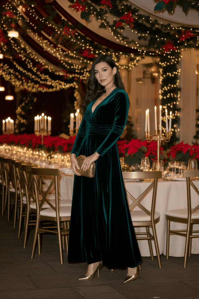 Velvet is basically Christmas in fabric form. A deep green velvet maxi dress is festive, luxe, and warm enough that you won’t freeze while waiting for the Uber. The color screams “holiday chic,” and the drape of velvet always flatters.