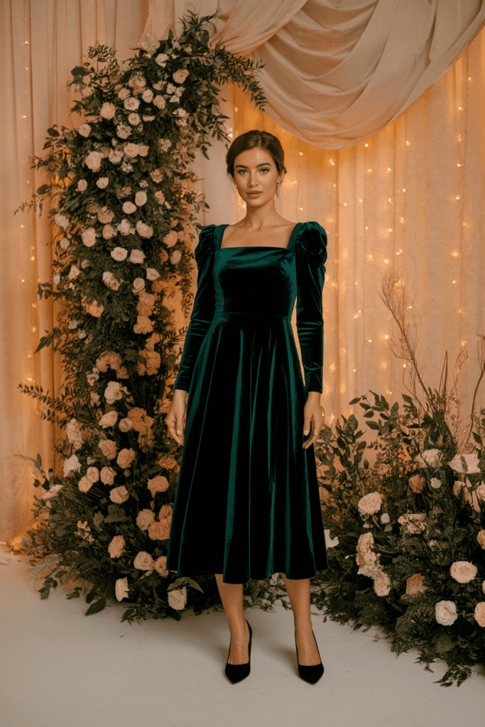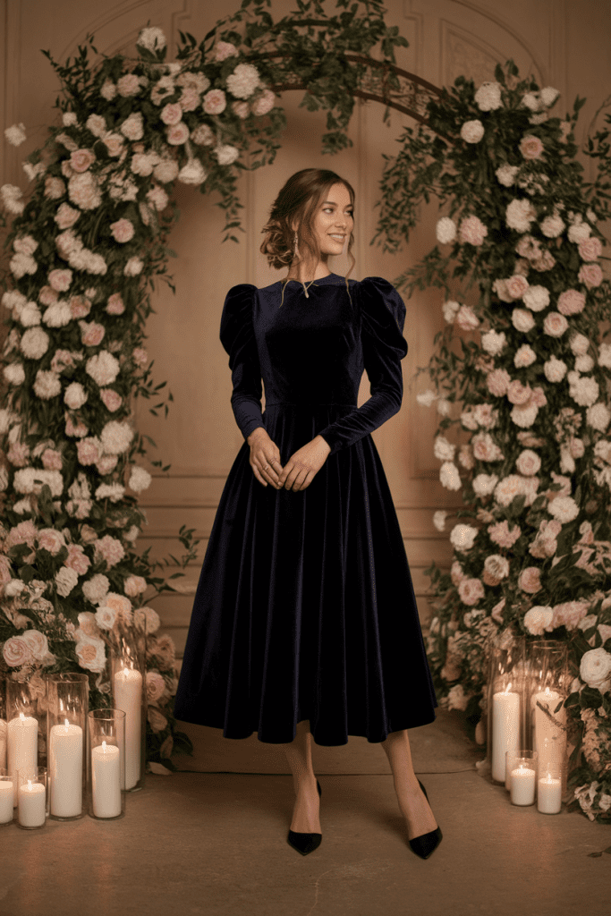 Puff sleeves are a thing, and in velvet they’re iconic. A velvet midi with puff sleeves adds playful volume without sacrificing elegance.